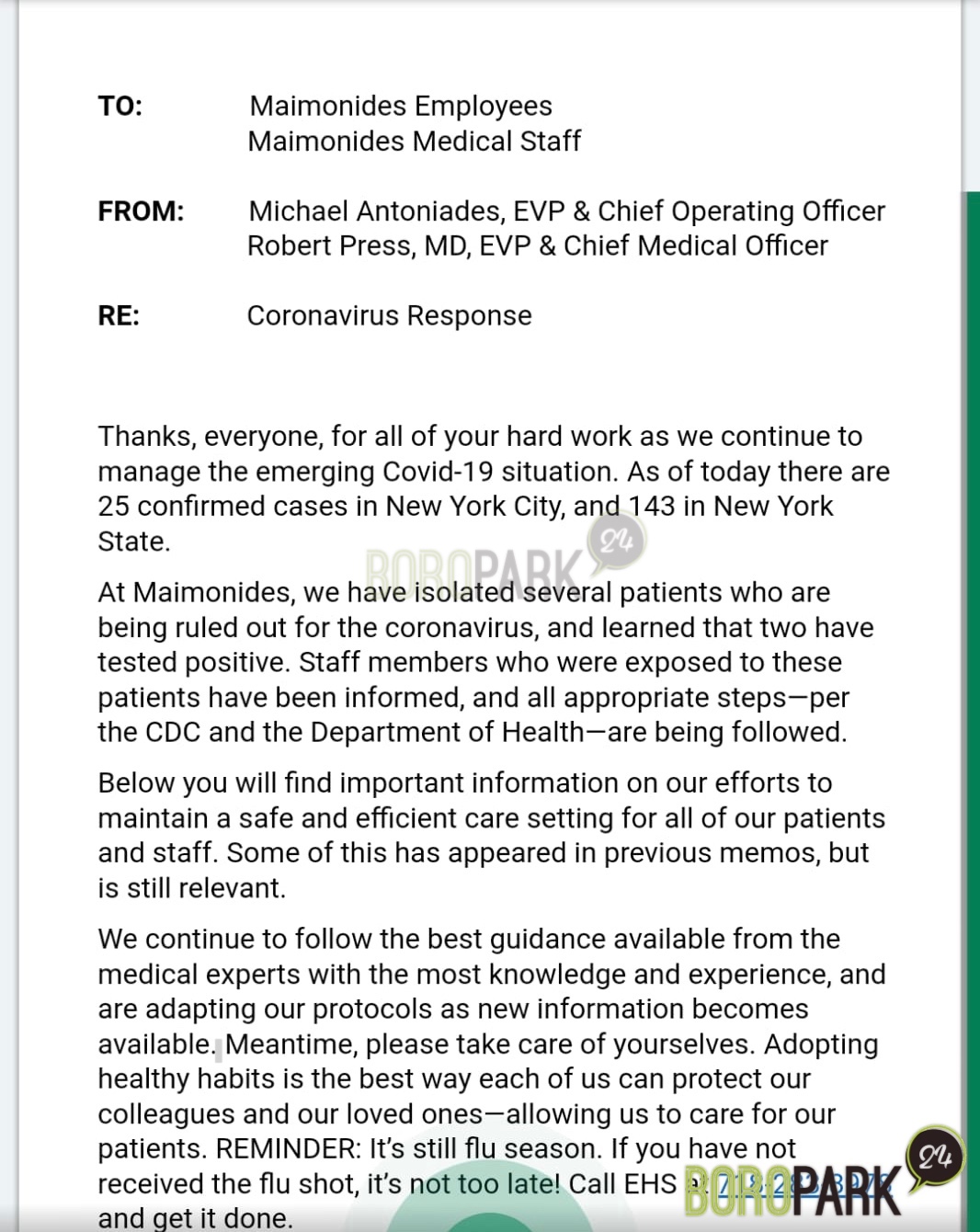Boro Park – Maimonides Medical Center confirmed Wednesday that two patients of theirs have tested positive for coronavirus.